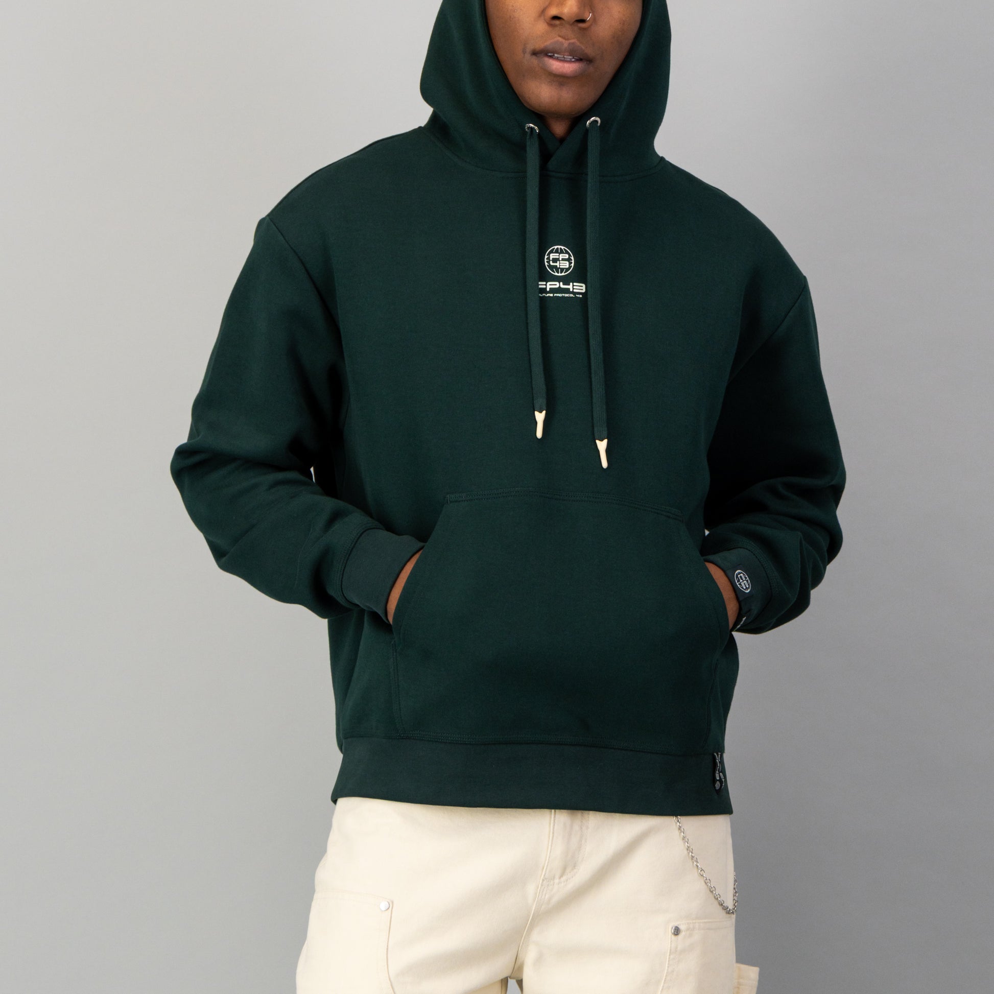 FP43 Hoodie — Soft cotton blend scuba featuring a relaxed fit with ribbed cuffs and hem, double layer hood with an adjustable drawcord, and kangaroo pocket. Designed with a FP43 chest print and low-key back print.