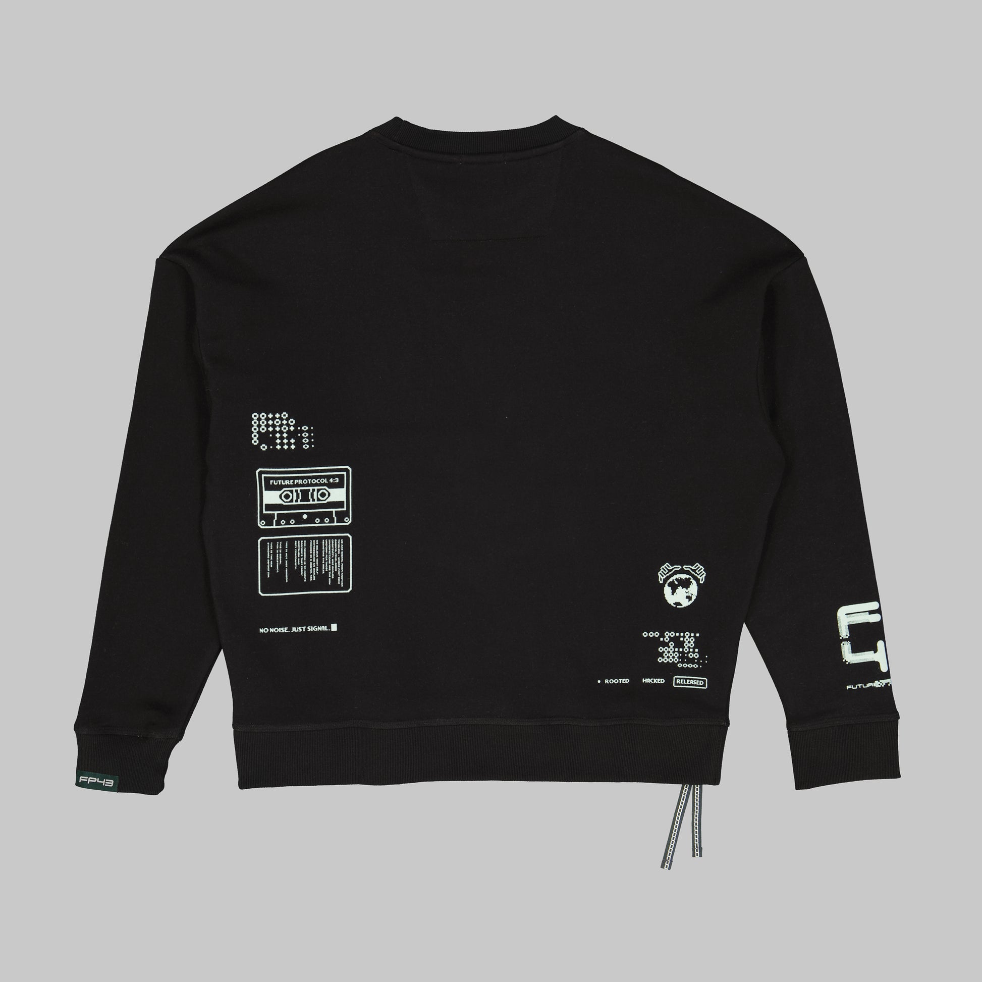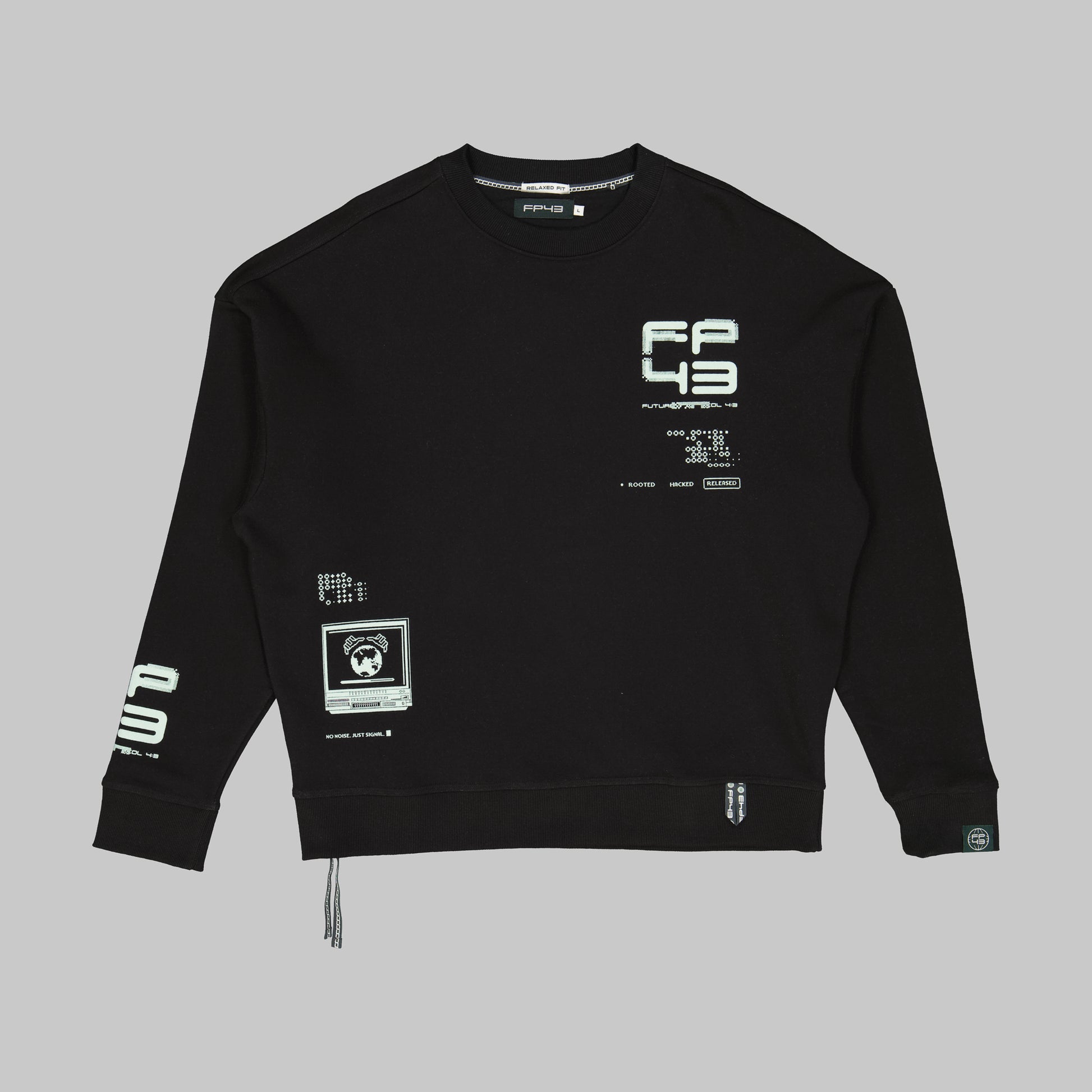 Analog Sweat — Soft cotton blend brushed fleece featuring a relaxed fit with ribbed crew neckline, cuffs and hem, multi-placement analog design FP43 prints on the front, back and sleeves. Designed with woven trims at the hem and cuff.