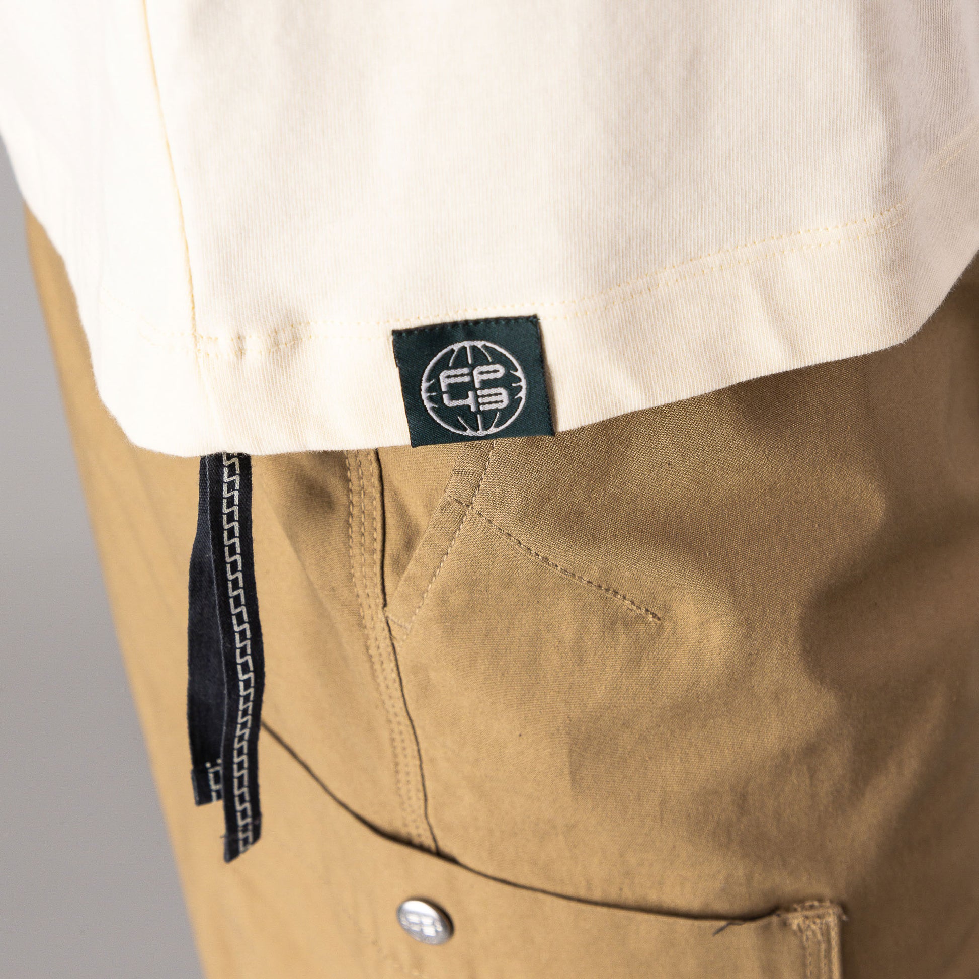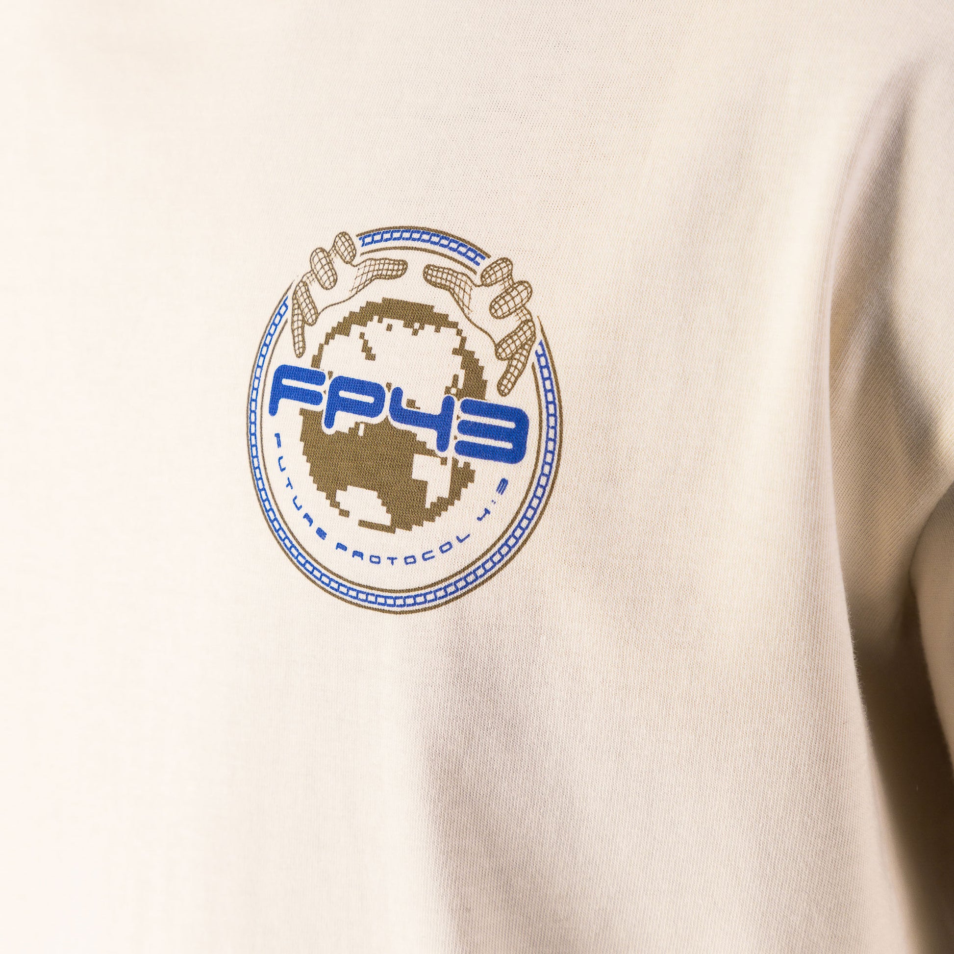 Back Placement Print Tee — Soft cotton single jersey featuring a ribbed crew neckline and FP43 chest print, and large back print. Designed in a relaxed fit and finished with woven trims on the hem.