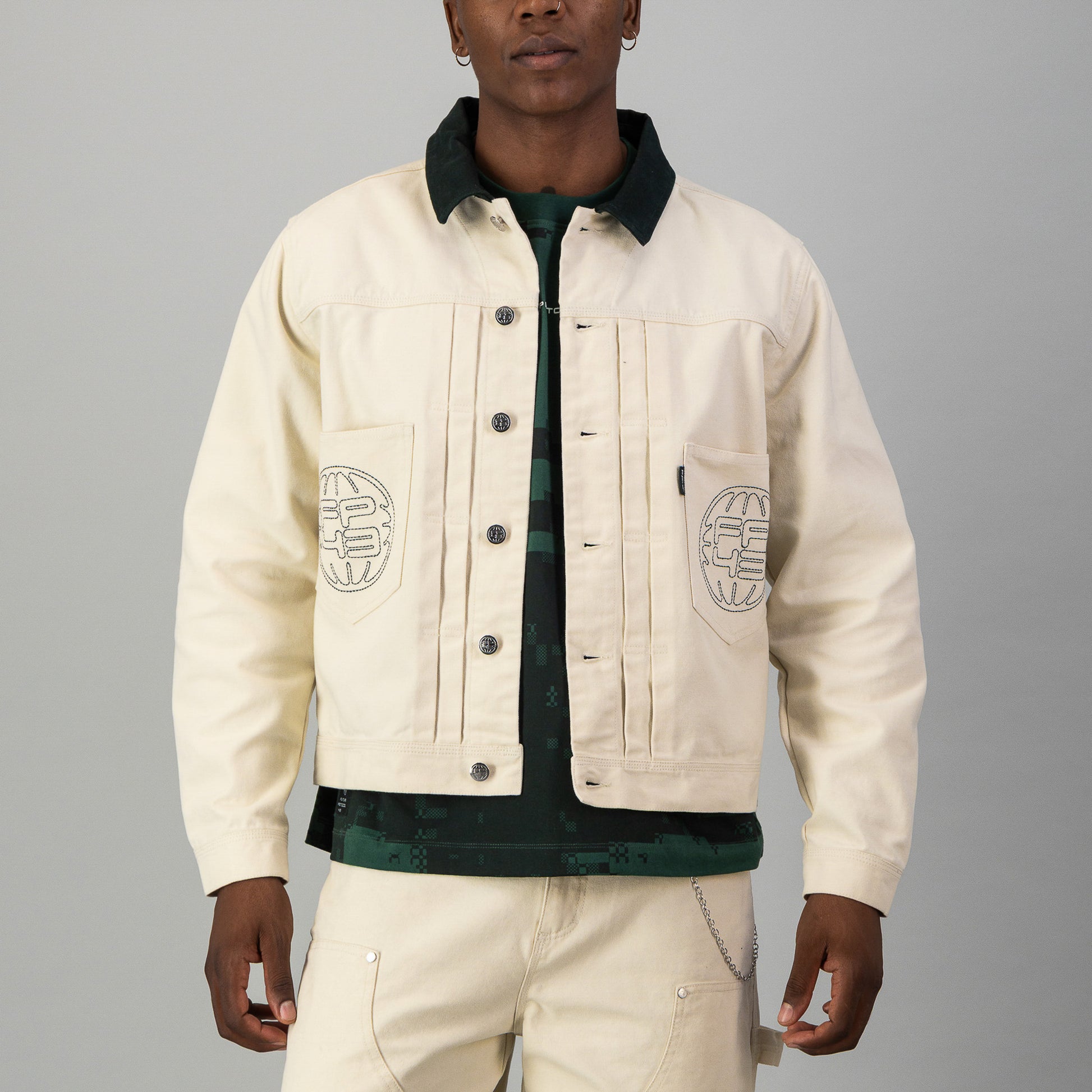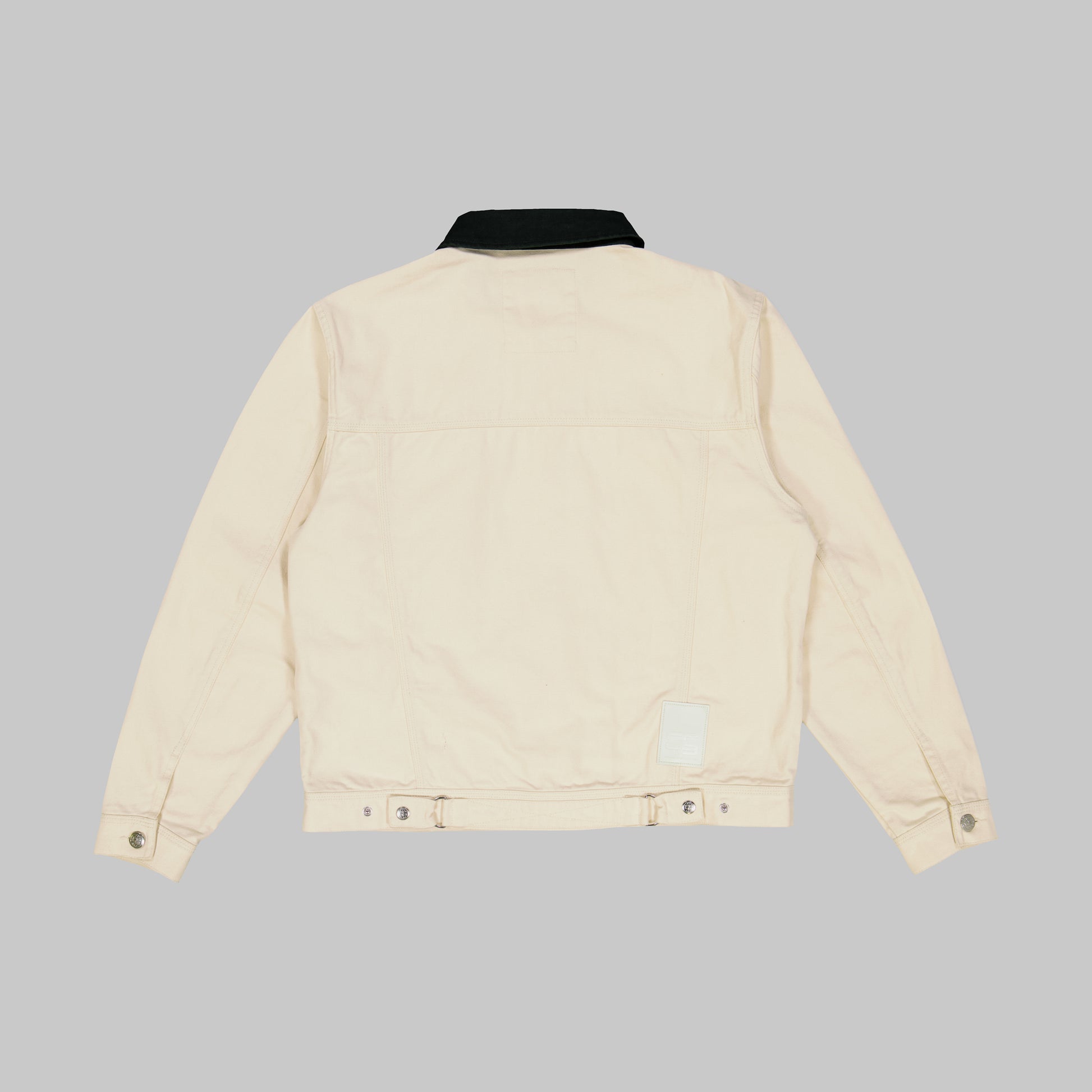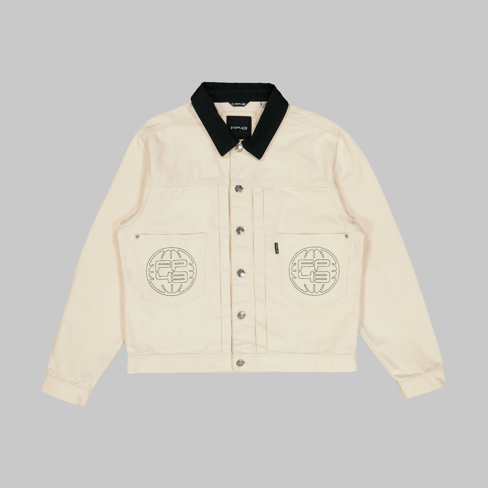 Carpenter Jacket — Double cotton canvas in a structured silhouette with contrast collar detailing. Designed with a button-up front closure, dual chest pockets with FP43 embossing and utility seam detailing throughout. Finished with adjustable back waist tabs and silver metal trims.