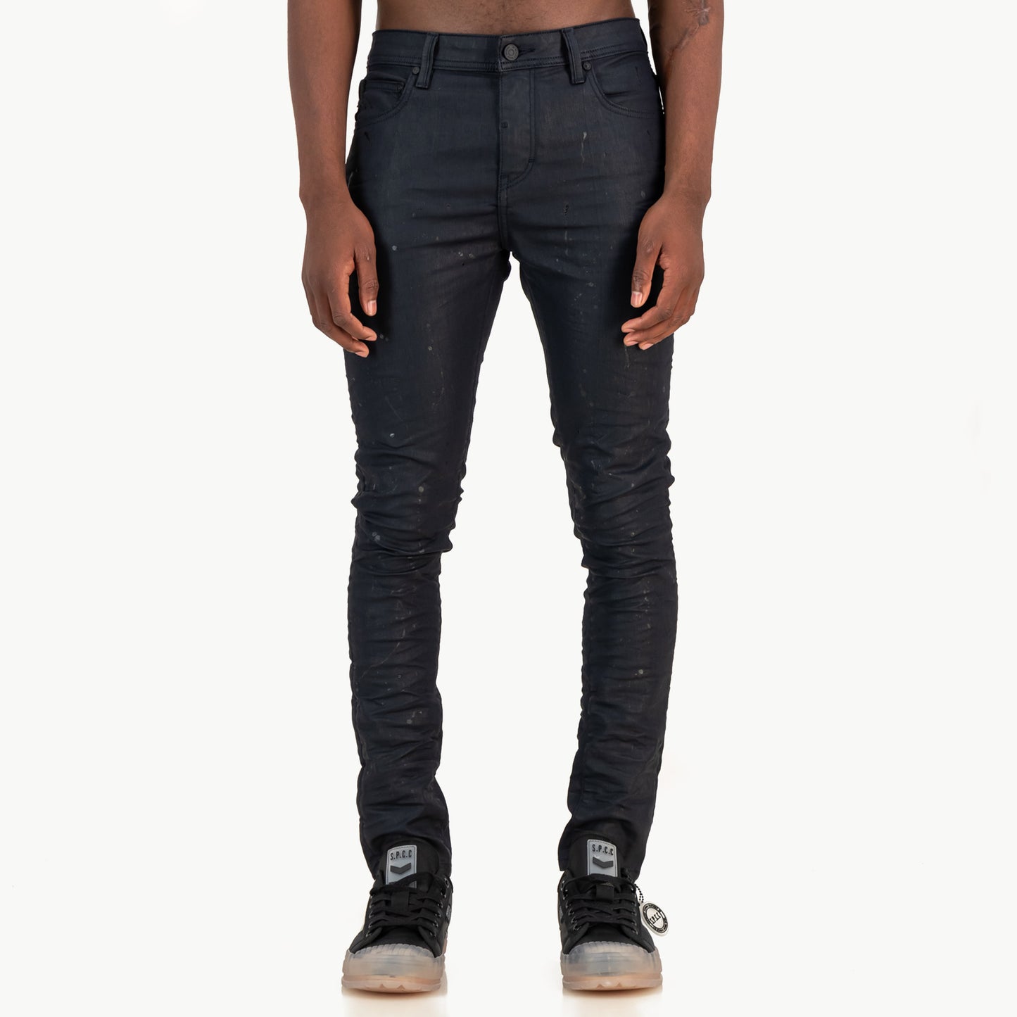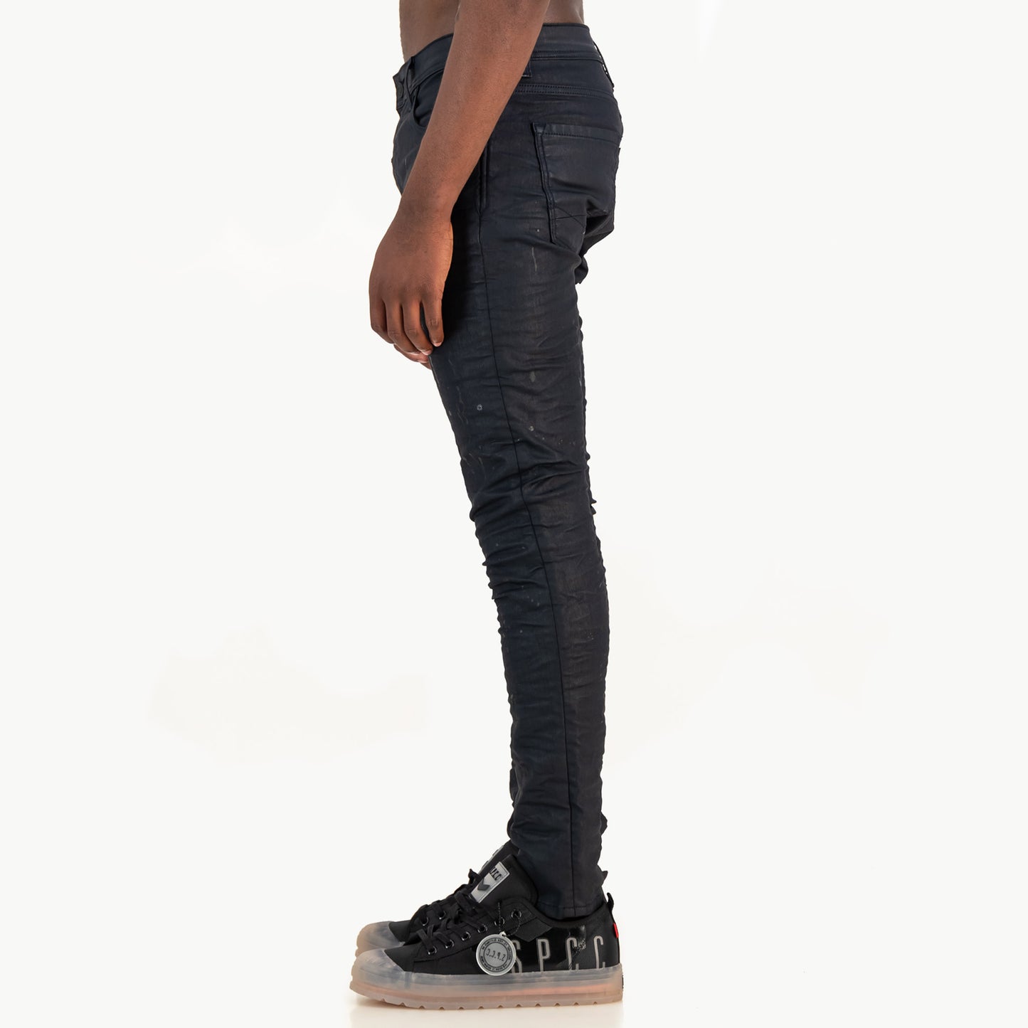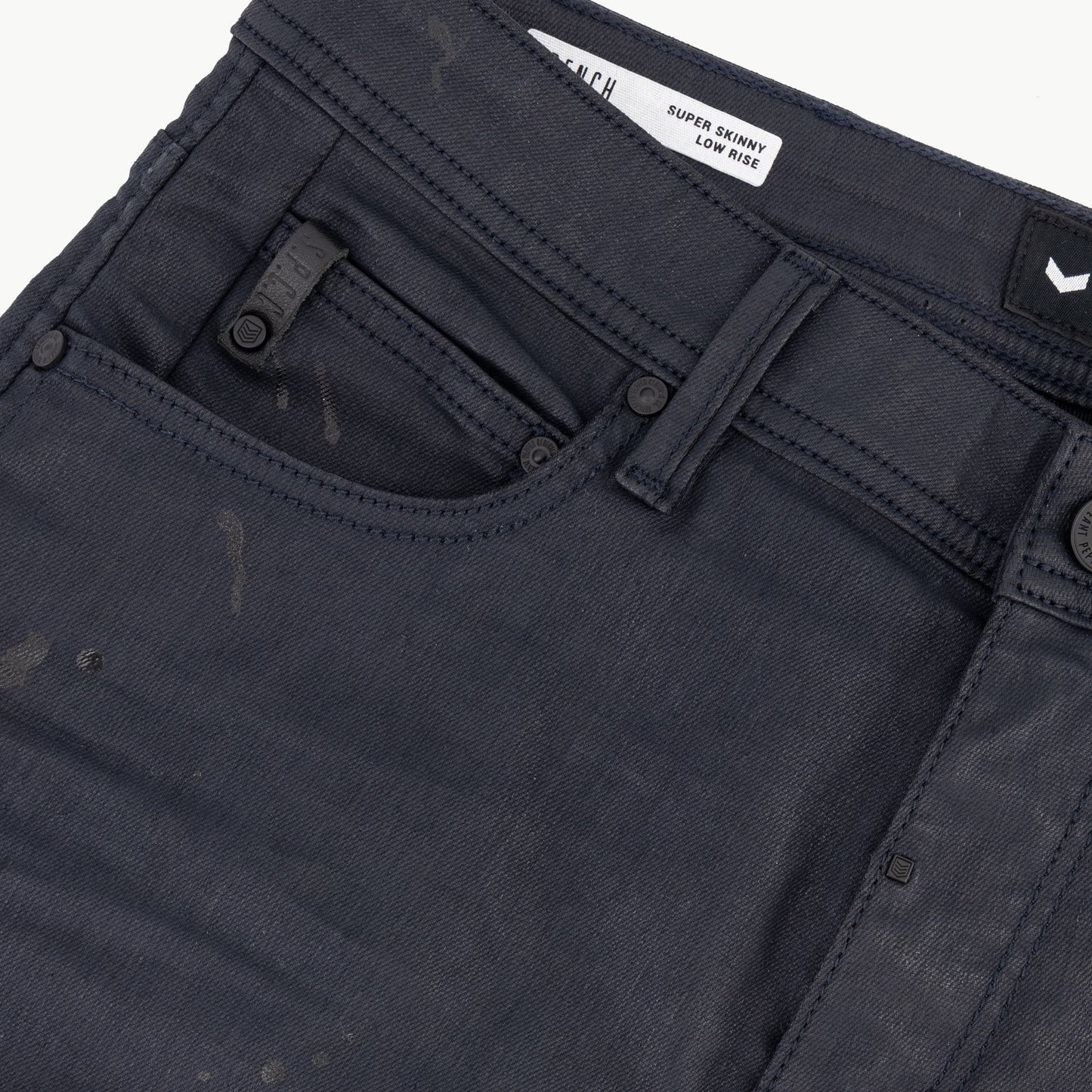 Make a statement with the Midnight Toxin Super Skinny Trench Fit. Crafted from premium double black denim, it features a waxy ink coating and black paint splatters. The zip fly, matte black hardware, and chevron fly bar add a touch of attitude. Complete with black leather accents, signature chevron stitching, and printed pocket bags.