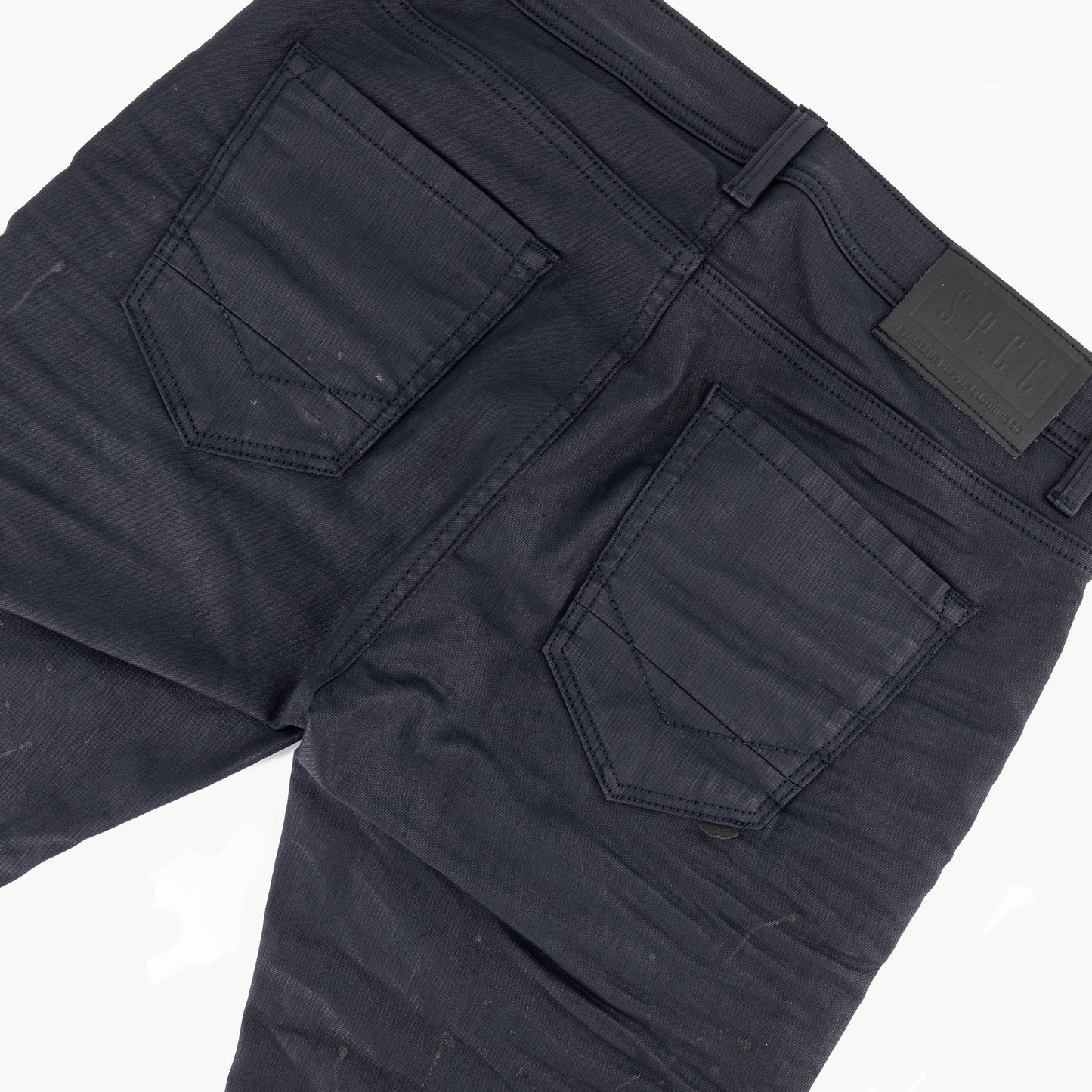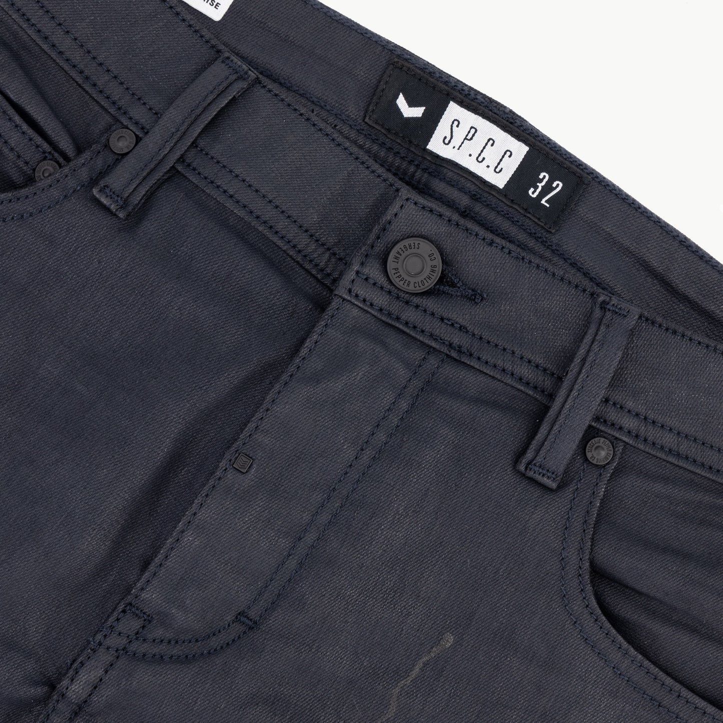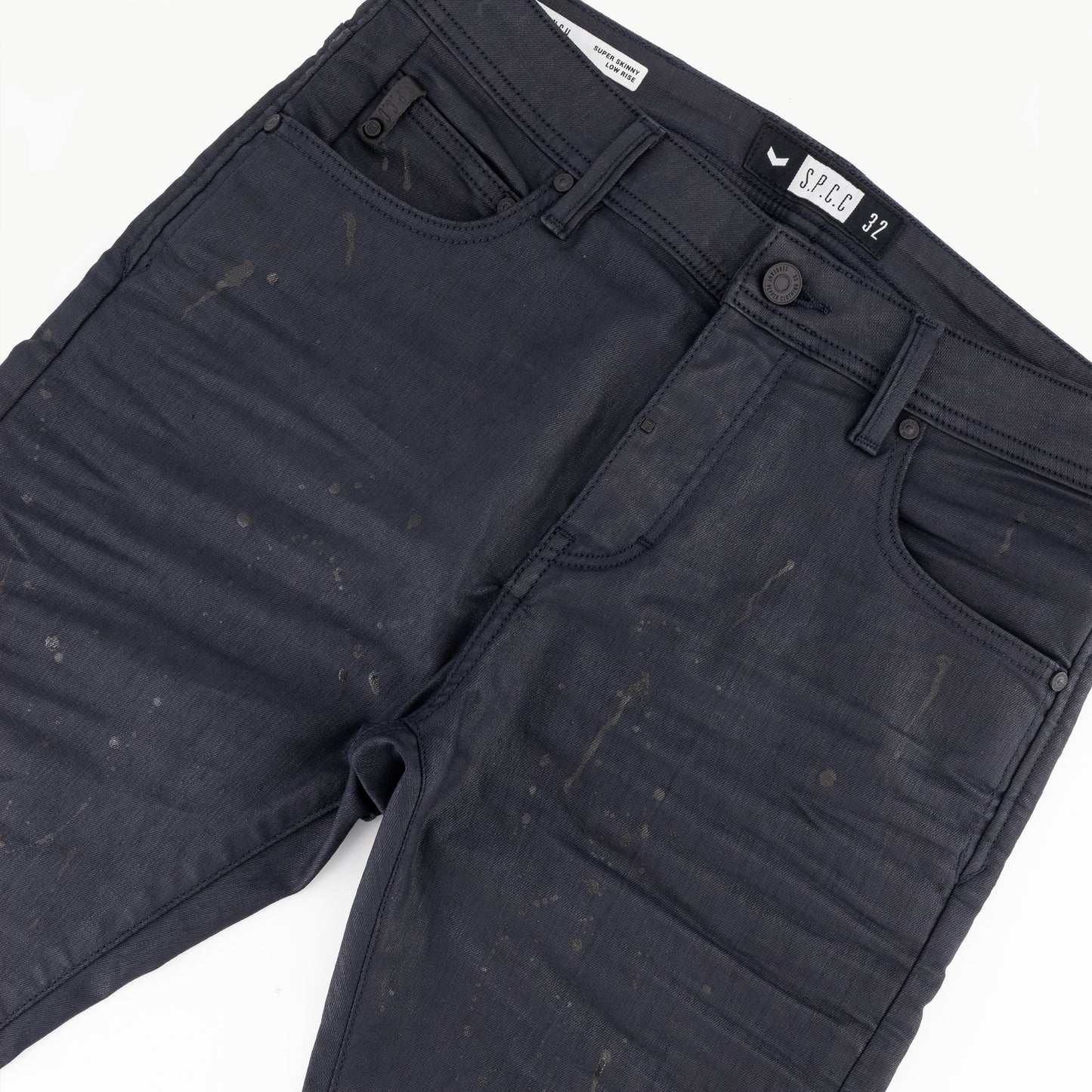 Make a statement with the Midnight Toxin Super Skinny Trench Fit. Crafted from premium double black denim, it features a waxy ink coating and black paint splatters. The zip fly, matte black hardware, and chevron fly bar add a touch of attitude. Complete with black leather accents, signature chevron stitching, and printed pocket bags.